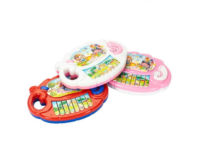 Piano de brinquedo em plástico com teclas interativas que reproduzem músicas pré-gravadas. Possui adesivos decorativos e detalhes texturizados, além de alça lateral. Funciona com duas pilhas AA não inclusas.