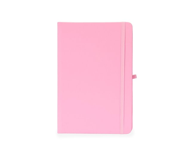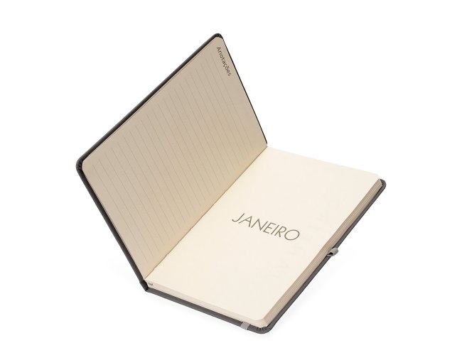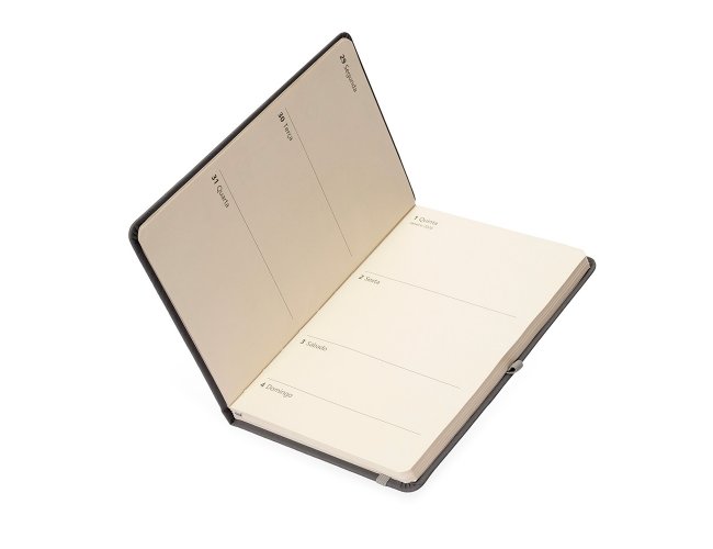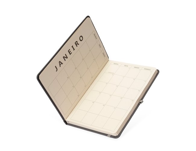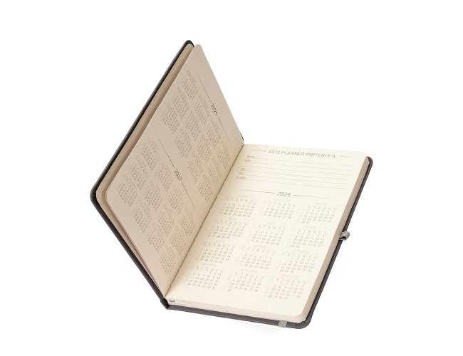 Planner com capa dura emborrachada, marca-páginas em fita de cetim, elástico para fechamento e suporte para caneta. Apresenta páginas dedicadas a dados pessoais, calendários de 2025 até 2027 e espaço para anotações diárias e semanais ao longo de todo ano de 2026.