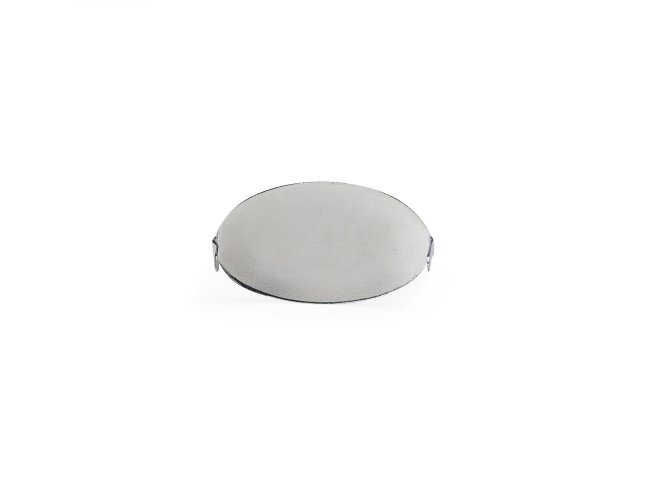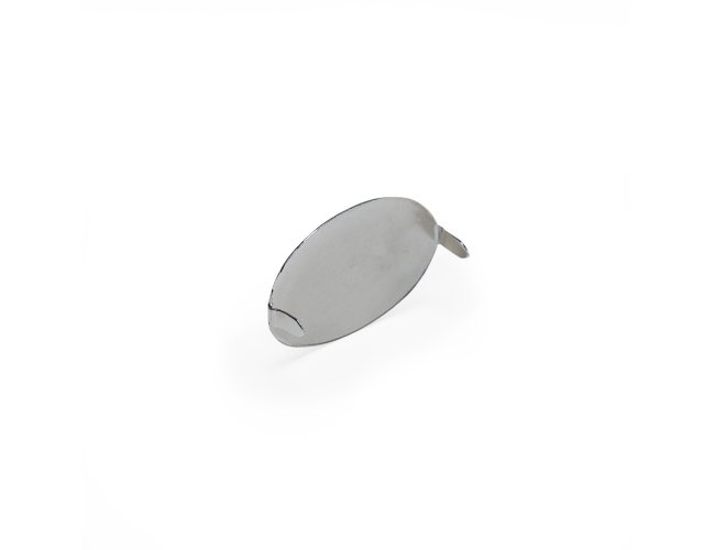 Plaquinha metálica oval para personalização. Possui hastes com ponta na parte traseira.