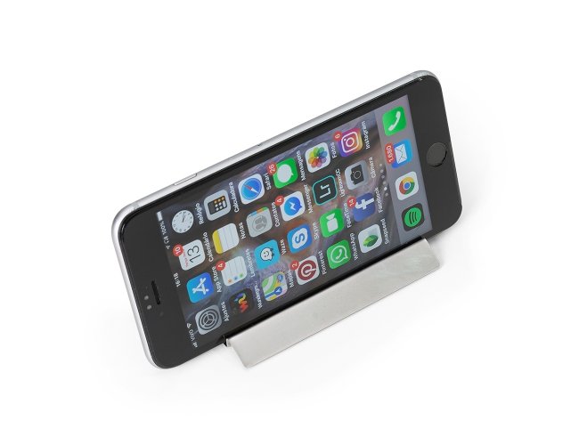 Porta celular inox, chapa metálica brilhante.