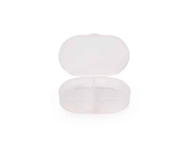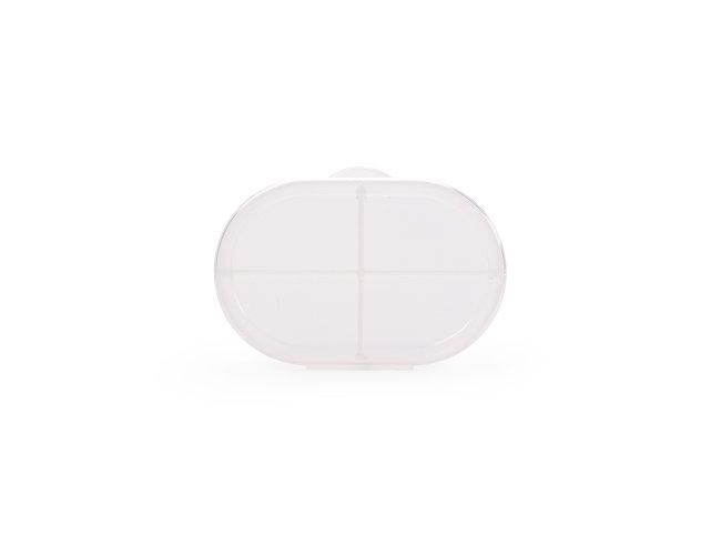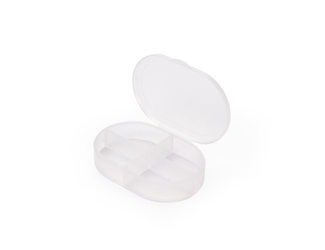 Um porta-comprimidos compacto feito em plástico. Possui quatro divisórias que oferecem mais possibilidades para organizar medicamentos ou pequenos objetos.