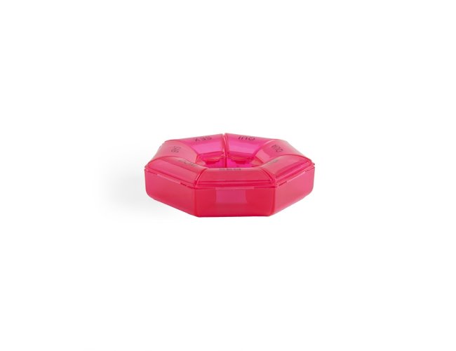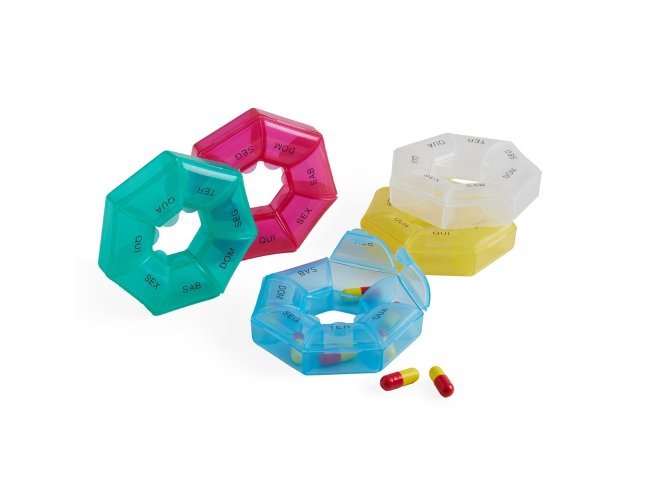 Porta comprimidos semanal, feito em plástico.