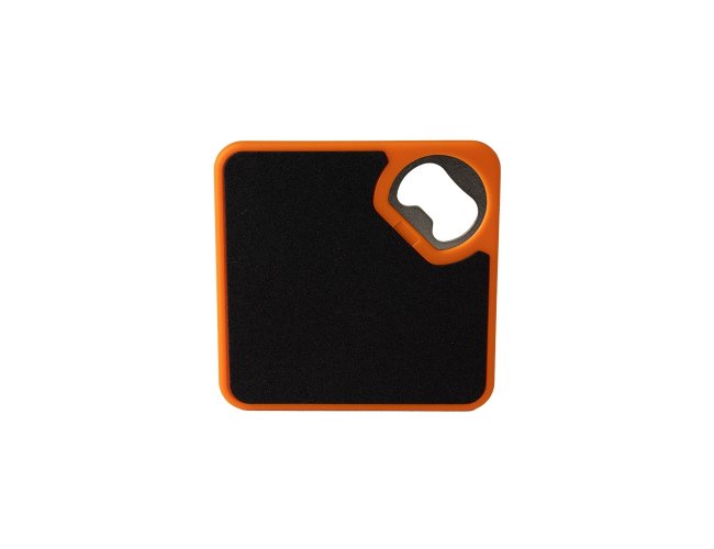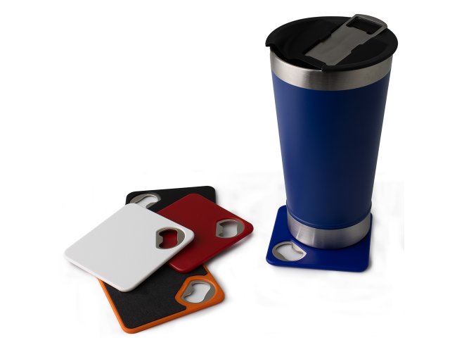Porta copo produzido em plástico resistente. Possui abridor de garrafa e base antiderrapante.