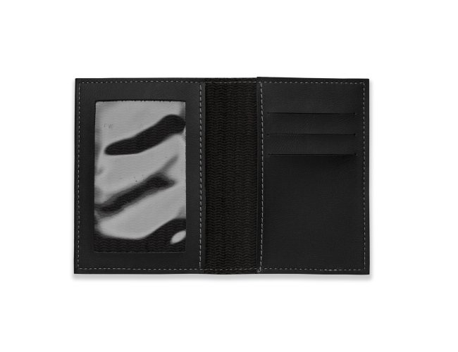 Porta-documento Bidins em couro sintético, capa frente e verso lisa, parte interna com bolso de visor plástico e três divisórias no próprio couro com bolso lateral.