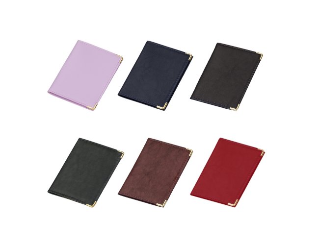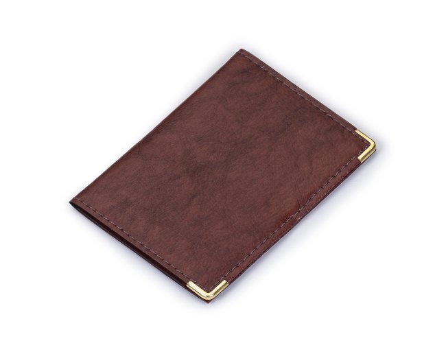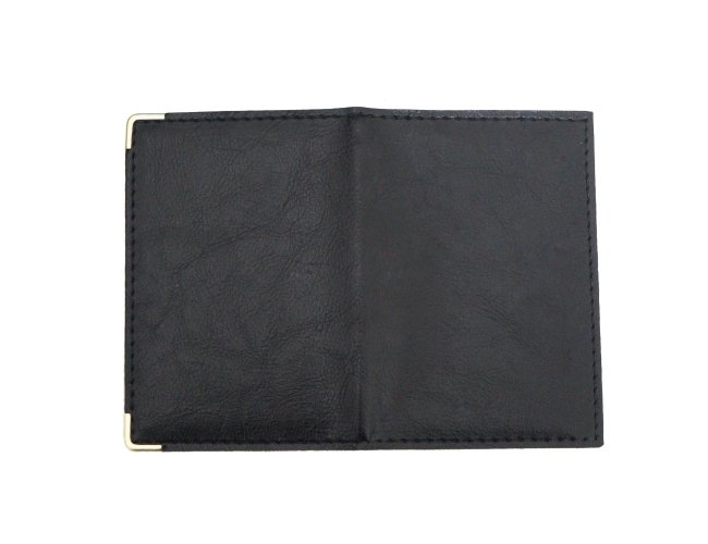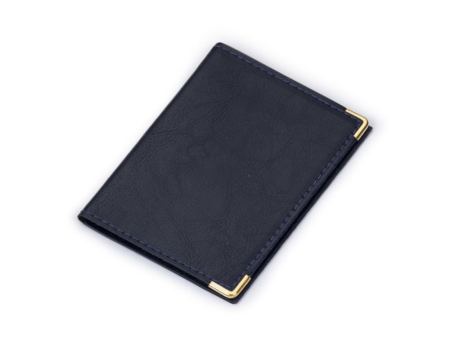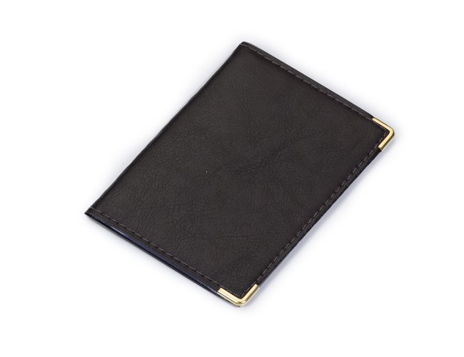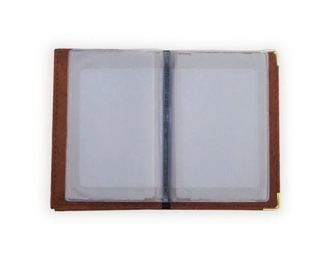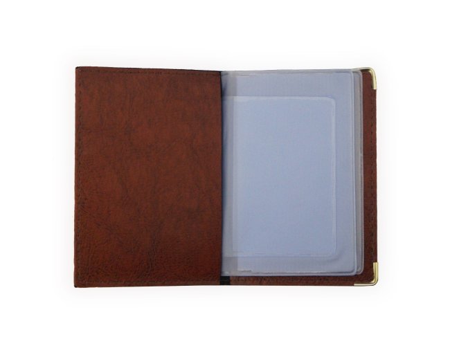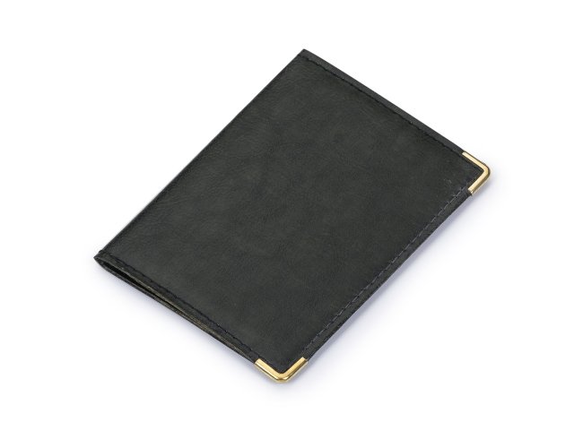 Porta-documento em couro sintético com cantoneira dourada, possui 4 divisórias plásticas grande e duas divisórias pequenas.