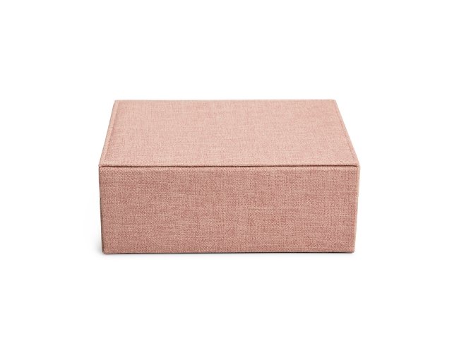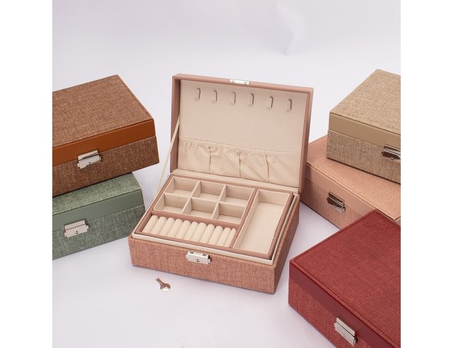 Porta-joias em Poliuretano e revestimento interno em tecido aveludado. Apresenta dois compartimentos principais com divisórias em diferentes tamanhos, incluindo uma repartição almofadada com ranhuras. Conta ainda com seis ganchos e um bolso com elástico na parte interna da tampa. O estojo possui trava de segurança e chave para fechamento.