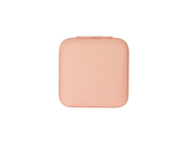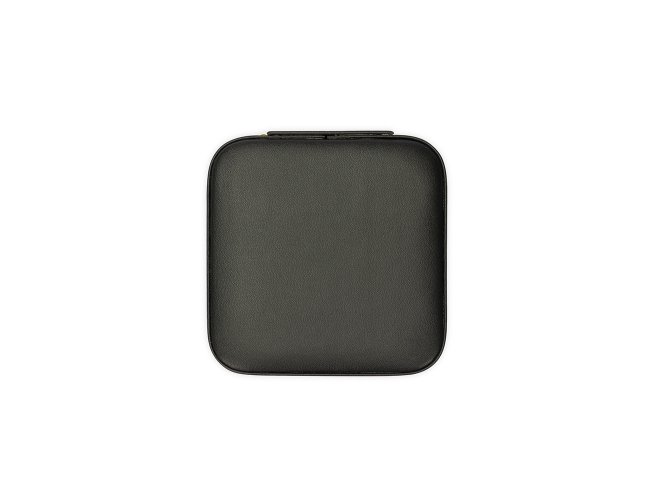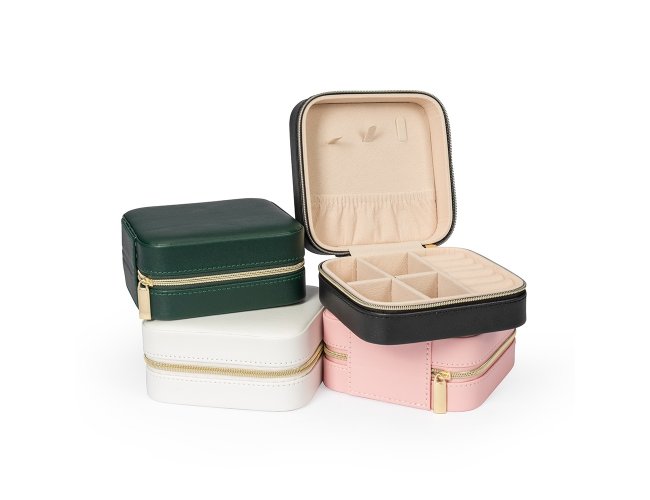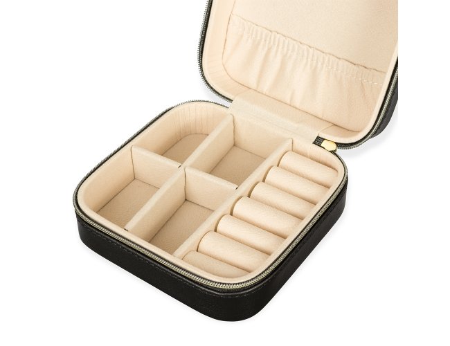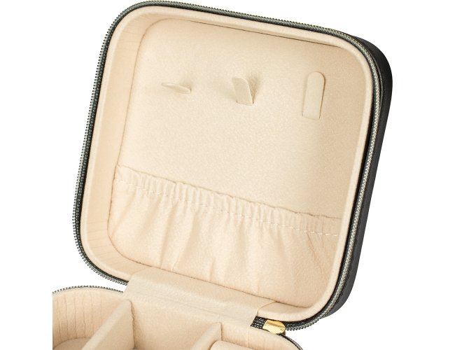 Este porta-joias em couro sintético é uma opção compacta para armazenar objetos menores com segurança. Possui revestimento interno com textura macia e fechamento em zíper, além de três mini ganchos, um bolso com elástico, uma divisória removível com quatro quadrantes e um compartimento estofado com ranhuras.