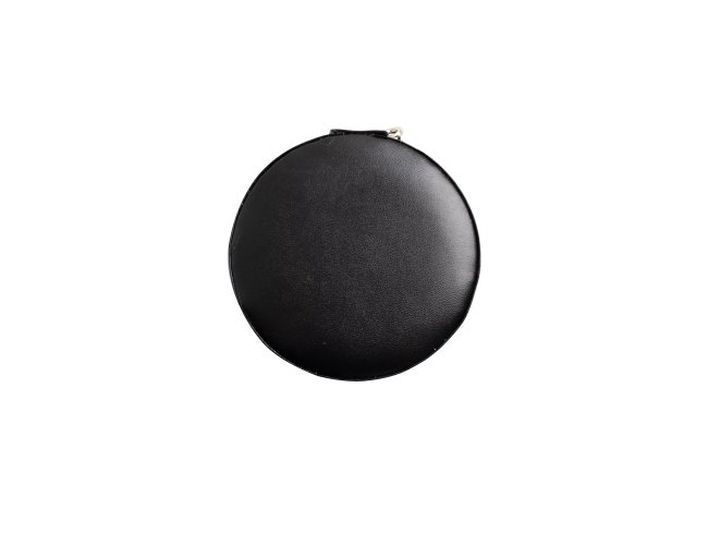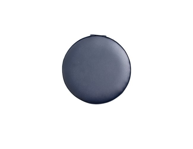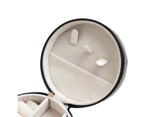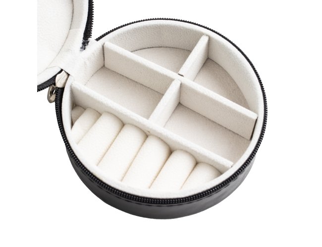 Porta-joias de couro sintético com revestimento aveludado. Possui compartimentos internos para anéis, brincos, pulseiras e colares.