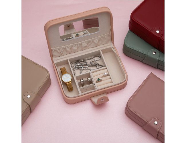 Porta-joias em couro sintético com revestimento aveludado e espelho. Possui compartimentos internos para anéis, pulseiras, colares e placas para brincos.