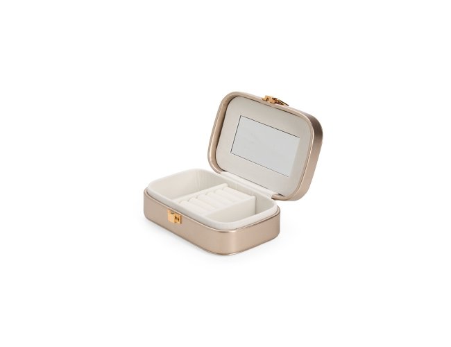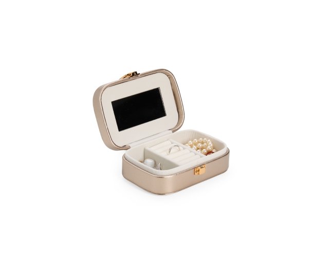 Porta-joias em poliuretano (PU) e revestimento interno em tecido aveludado. Conta com espelho interno, duas divisórias, repartição almofadada com ranhuras e trava de segurança.