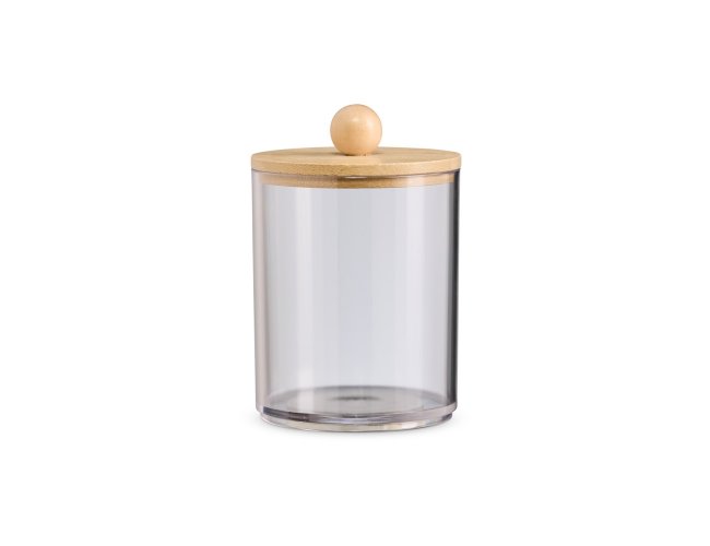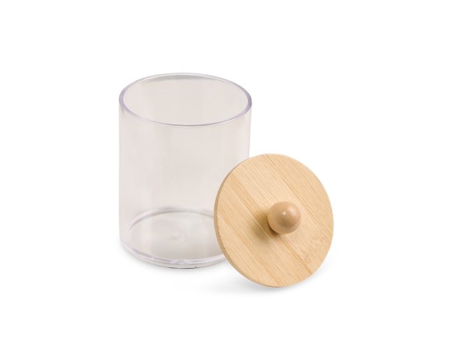 Porta objetos em acrílico com tampa de bambu.