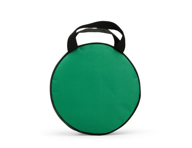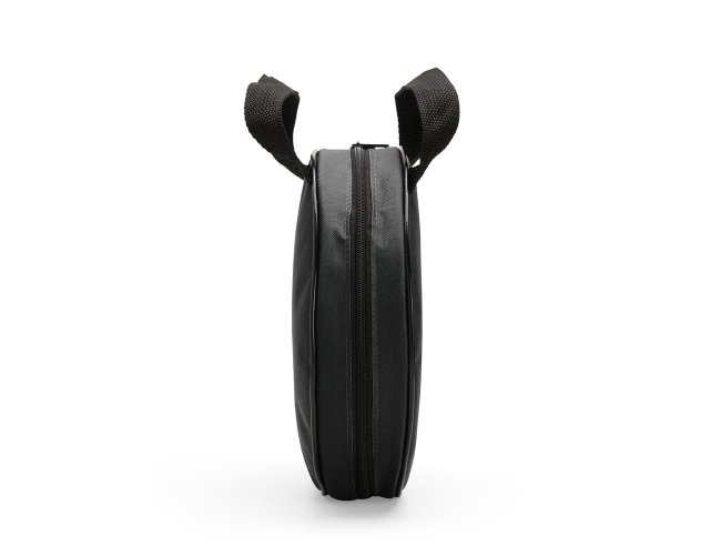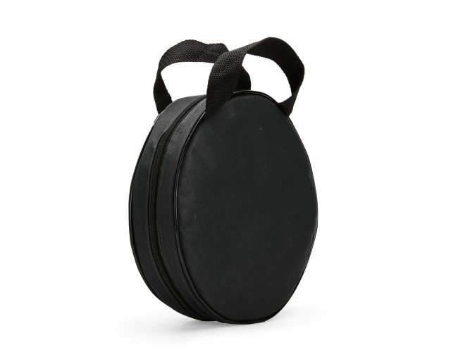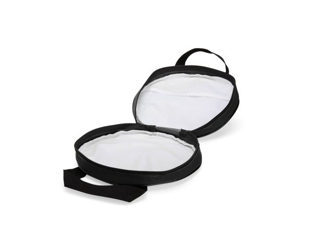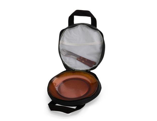 Bolsa porta-pratos confeccionada em poliéster 600 impermeável, com fechamento em zíper e compartimento interno que inclui bolso em tela de nylon. Possui duas alças de nylon para transporte.