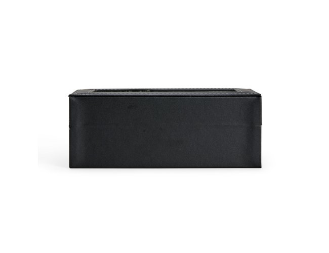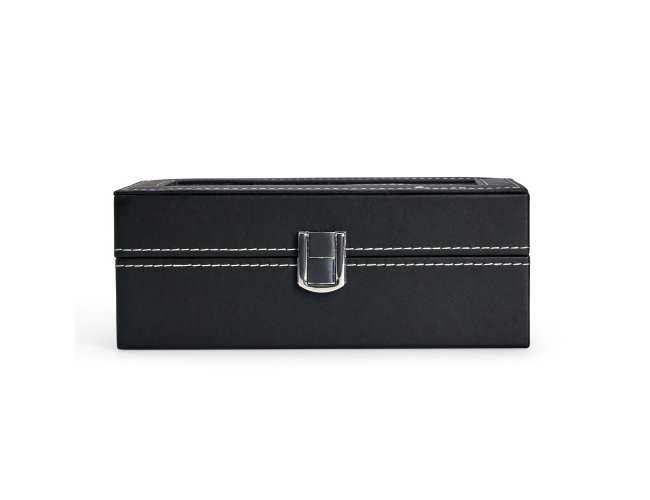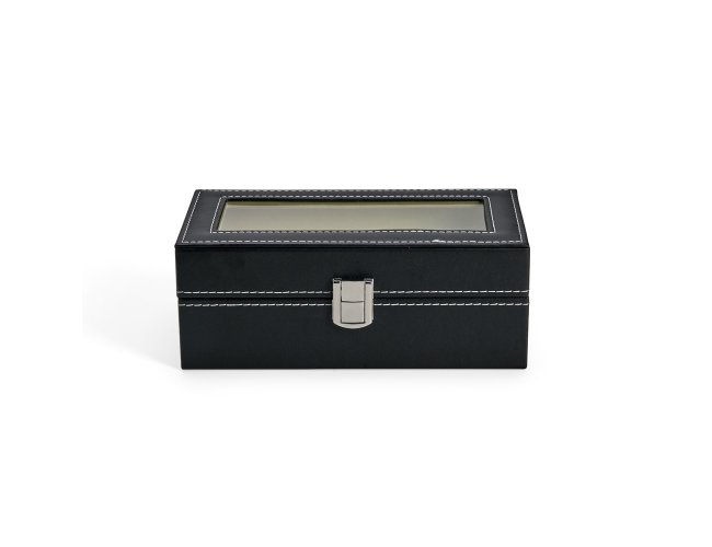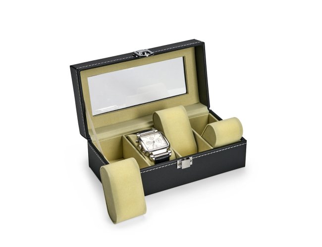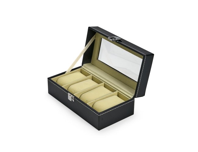Porta-relógios com acabamento em couro sintético à base de PVC. Possui revestimento interno em veludo e quatro compartimentos fixos com almofadas removíveis de espuma. Conta ainda com visor transparente em vidro e trava de segurança para o fechamento do estojo.