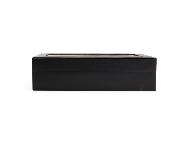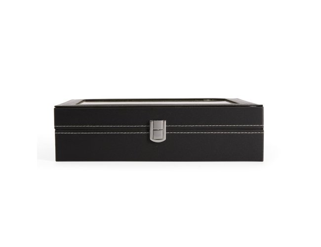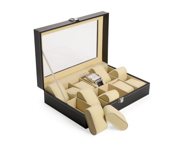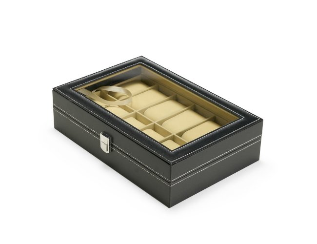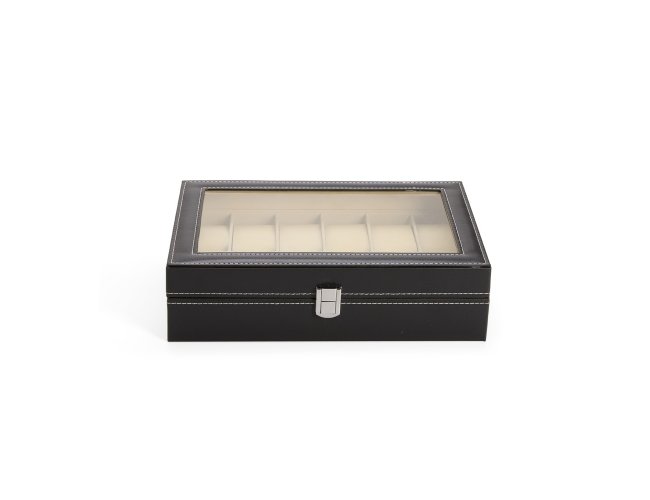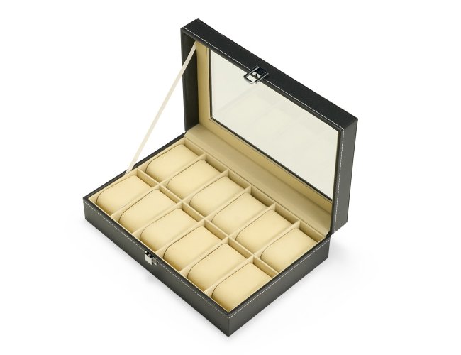 Porta-relógios com acabamento em couro sintético à base de PVC e revestimento interno em veludo. Conta com 12 compartimentos fixos com almofadas removíveis em espuma, além de visor feito em vidro e trava de segurança para fechamento do estojo.