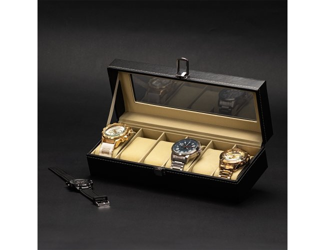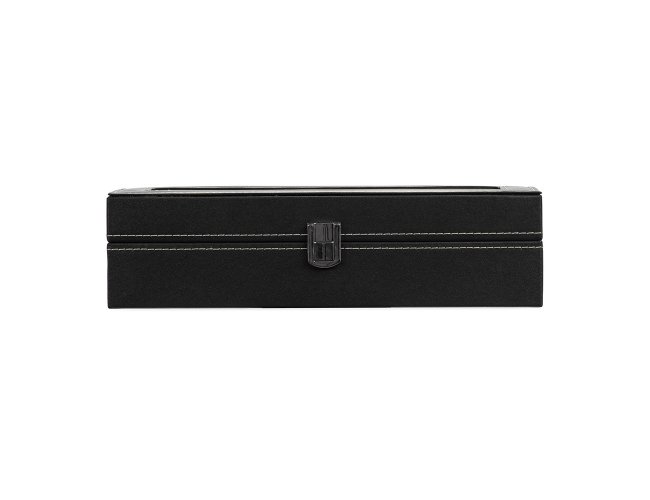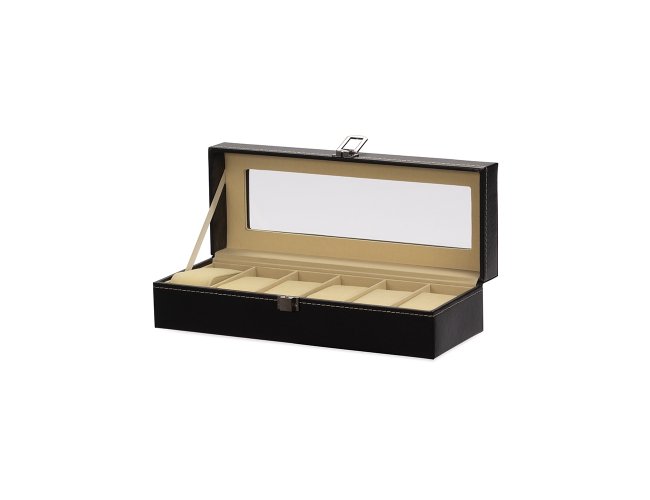 Porta-relógios com acabamento em couro sintético e interior revestido em veludo. Possui seis divisórias com almofadas removíveis, tampa com visor em acrílico e abertura em 90 graus, facilitando a visualização e o manuseio dos acessórios. Conta com trava de segurança para fechamento do estojo.