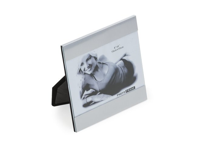 Porta retrato 15 x 10 com duas chapas metálicas(superior e inferior) que podem ser removidas. Possui uma tela de vidro e parte traseira(apoio) revestido de veludo, acompanha película protetora.