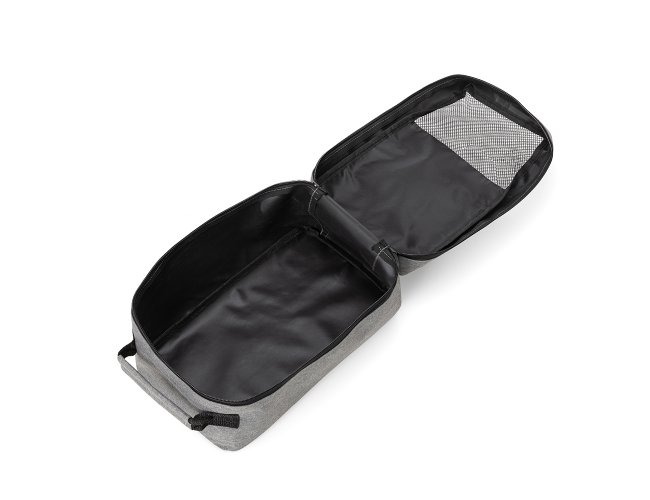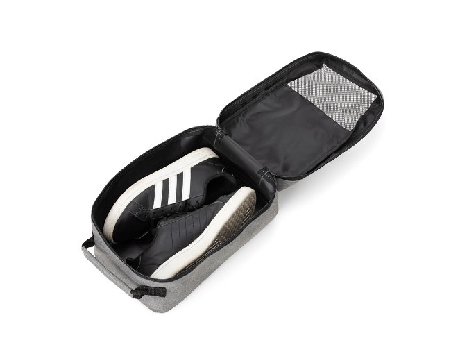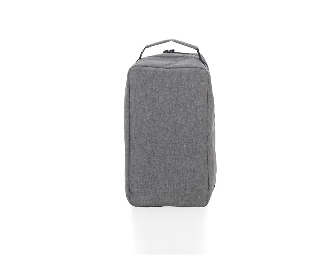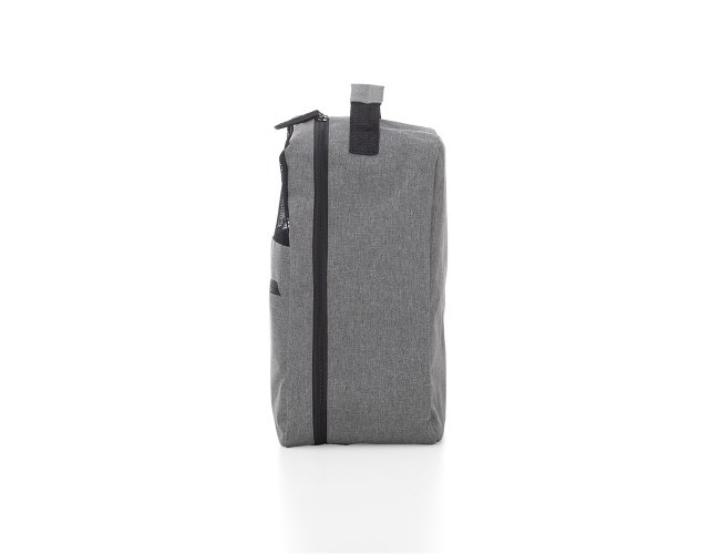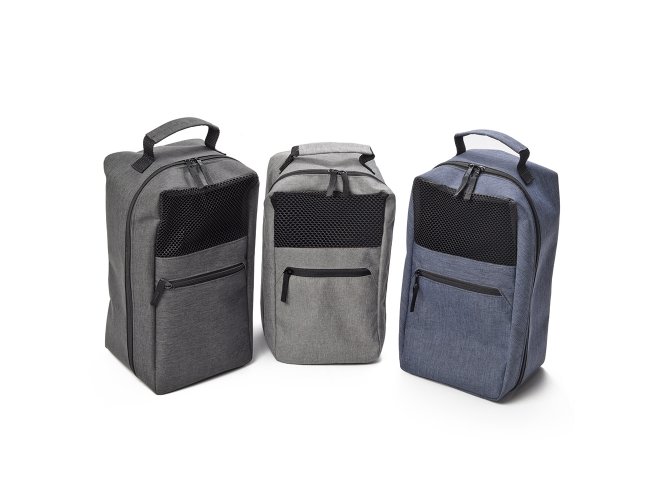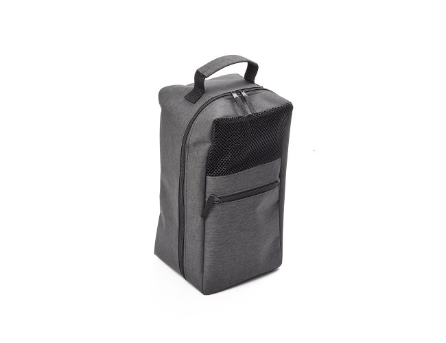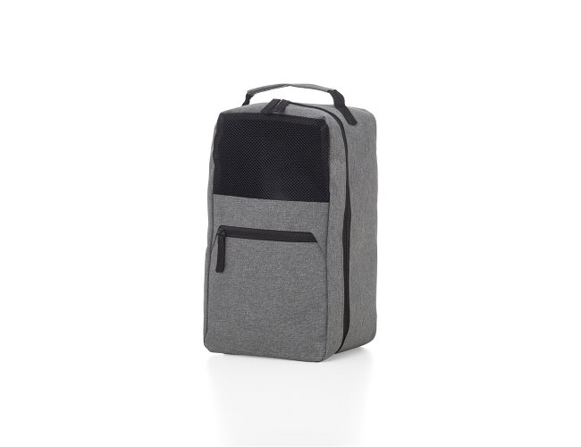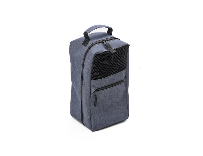 Porta tênis em poliéster. Possui bolso frontal com zíper, detalhe telado na parte frontal e alça de mão em nylon.