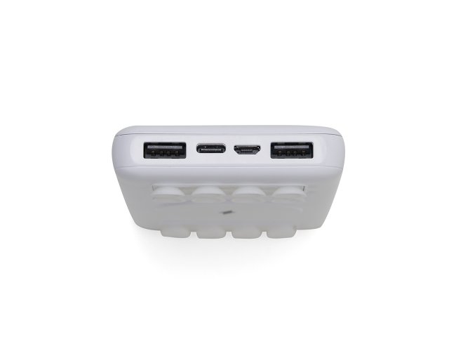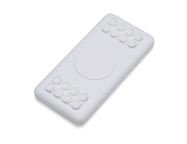 Carregador portátil de indução com 10.000mAh e indicador led de bateria, contém dois conjuntos de ventosas nas extremidades da área de indução, ideal para fixação do celular durante este modo de carga. O carregador possui duas portas de saídas USB, possibilitando o carregamento de dois dispositivos ao mesmo tempo, além do modo de carga por indução ilustrado por um raio, indicando a área correta para este modo de carga. O carregador possui duas portas de entradas, Tipo-C e V8. Acompanha cabo USB