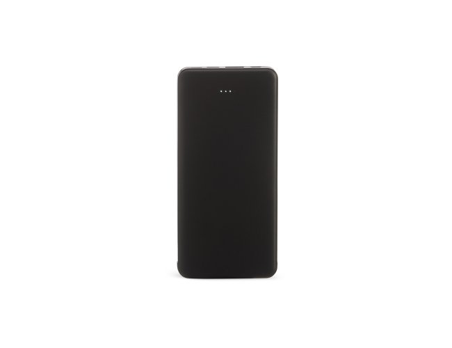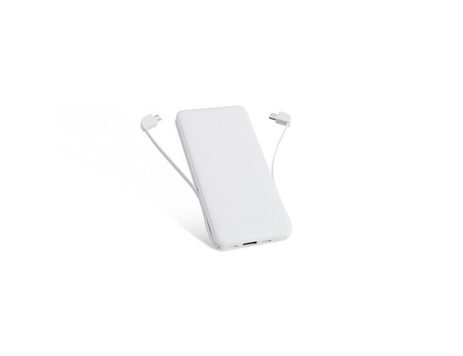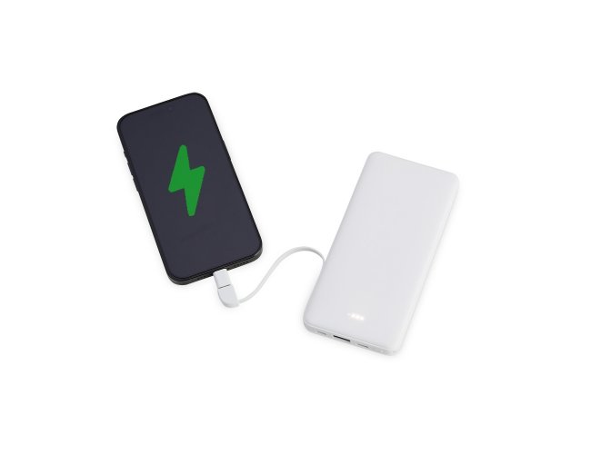 Power bank plástico de 10.000mAh com indicadores led de bateria e cabos acoplados: Tipo-C e V8. Acompanha cabo USB V8 e adaptador Lightning.