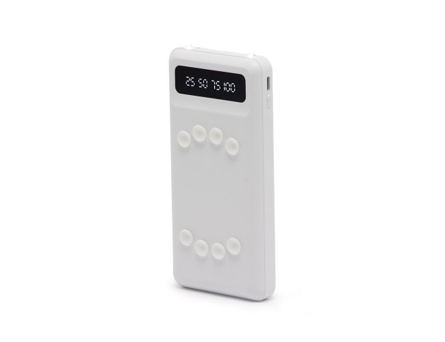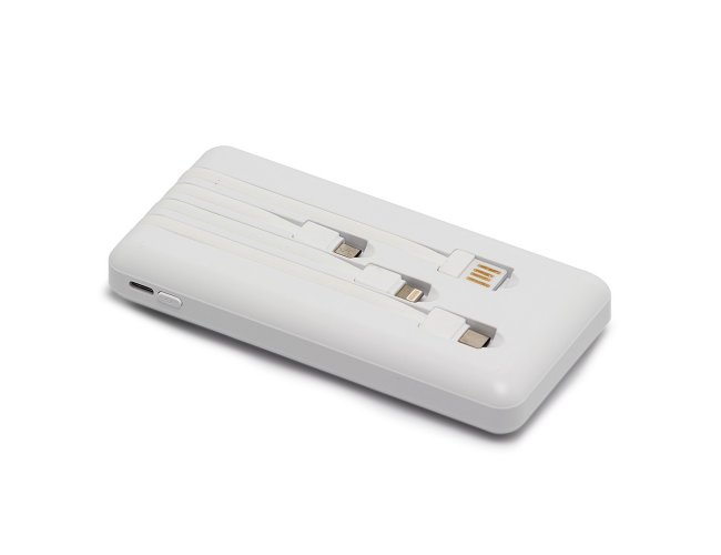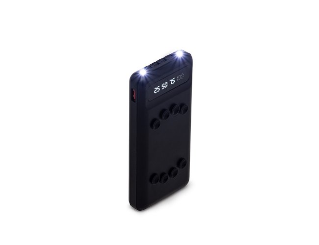 Carregador power bank de 10.000mAh com lanternas e múltiplas saídas. Fabricado em plástico com display integrado, este power bank vem equipado com quatro cabos de carregamento, eliminando a necessidade de transportar cabos extras. Compatível com entradas V8, Tipo-C, Lightning e USB, ele oferece praticidade absoluta. Para um transporte conveniente e seguro, o power bank possui ventosas para fixação do celular e uma capacidade real de 6.000mAh para manter os dispositivos sempre carregados.. Acompanha cabo USB-V8.