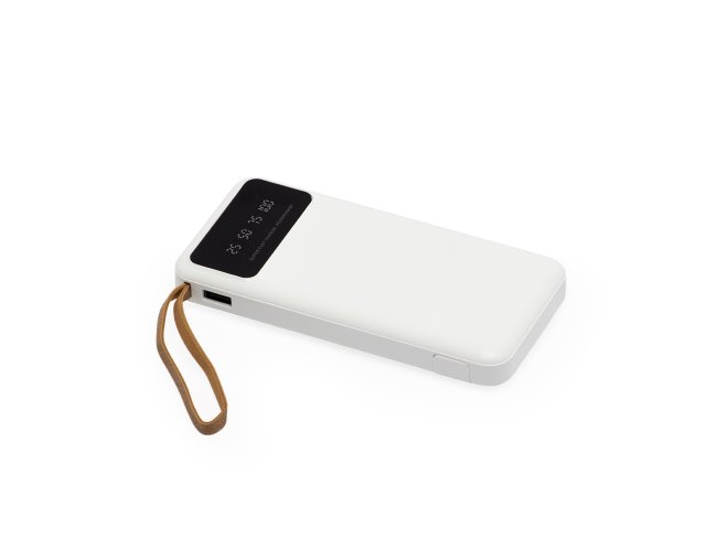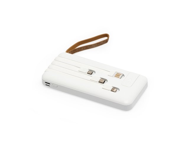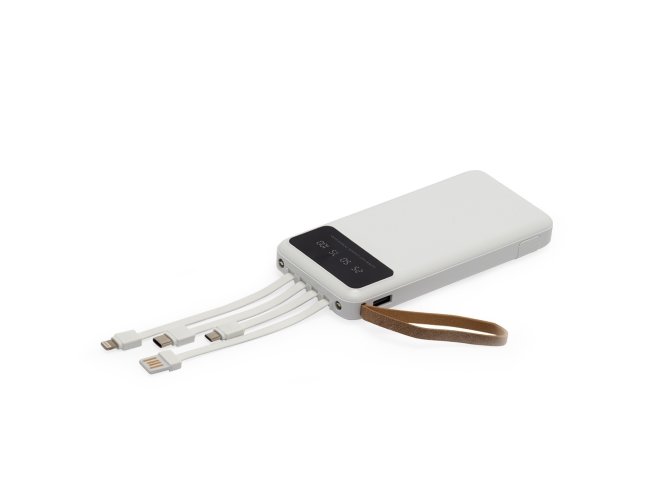 Carregador power bank de 10.000mAh com lanternas, múltiplas saídas e suporte para celular. Fabricado em plástico com display integrado, este power bank vem equipado com quatro cabos de carregamento, eliminando a necessidade de transportar cabos extras. Compatível com entradas V8, Tipo-C, Lightning e USB, praticidade é o sinônimo deste carregador. Com alça de couro sintético e um suporte funcional para celular, estilo gaveta, o power bank possui capacidade real de 6.000mAh para manter os dispositivos sempre carregados. Acompanha cabo USB-V8.
