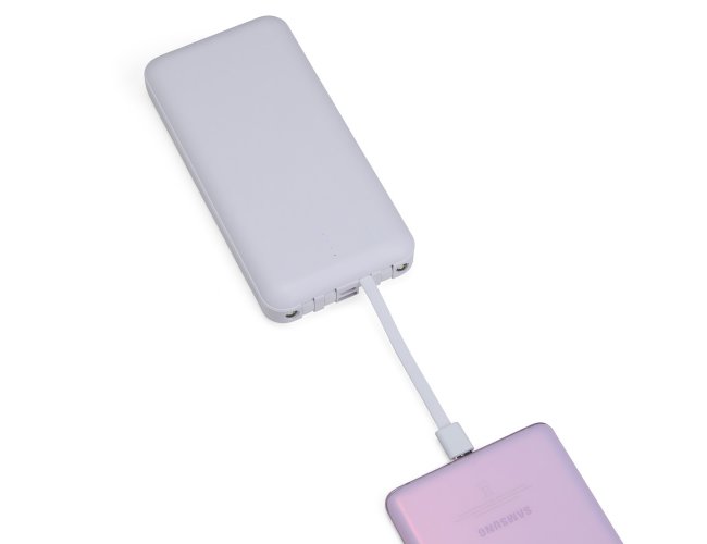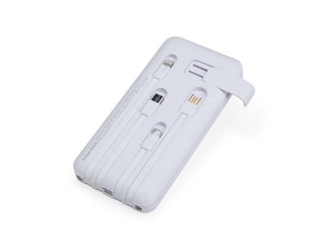 Nosso power bank 10.000mAh 4 em 1 é uma solução prática e eficiente para manter os dispositivos sempre carregados, mesmo quando estiver em movimento. Feito em plástico, este carregador portátil é compatível com diversos dispositivos, pois conta com quatro cabos acoplados: Lightning, tipo-C, micro-USB e USB. Além disso, o power bank possui um suporte lateral integrado, feito para manter o celular na horizontal durante o carregamento, permitindo assistir vídeos ou participar de reuniões enquanto o dispositivo carrega. Funcional, nosso carregador é equipado com duas lanternas para situações de emergência. Sua entrada micro-USB 5V=2.1A e saída USB 5V=2.1A, oferece um desempenho eficiente e rápido para o dia a dia.