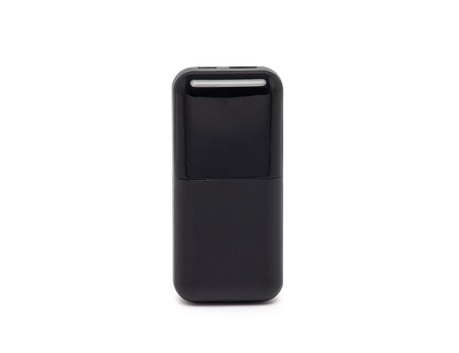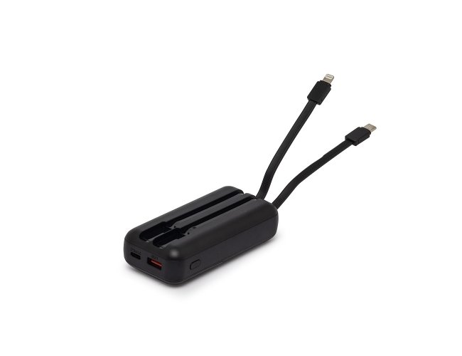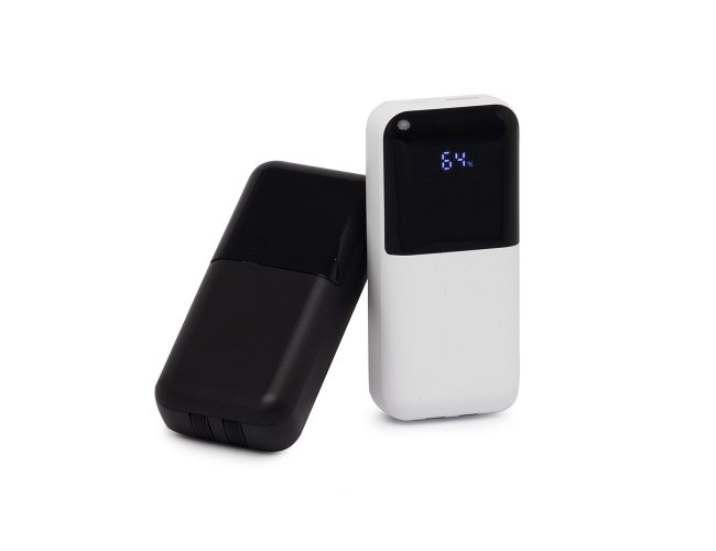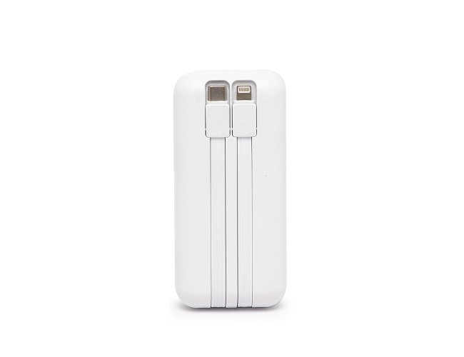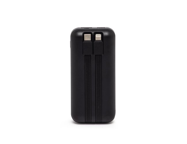 Carregador portátil plástico com 6.000mAh, com duas saídas, tipo C e lightning, display com indicador de bateria. Possui entrada tipo C e USB. Acompanha cabo tipo C.