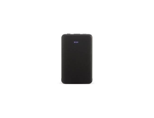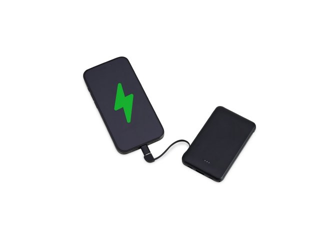 Power bank plástico de 5.000mAh com indicadores led de bateria e cabos acoplados: Tipo-C e V8. Acompanha cabo USB V8 e adaptador Lightning.