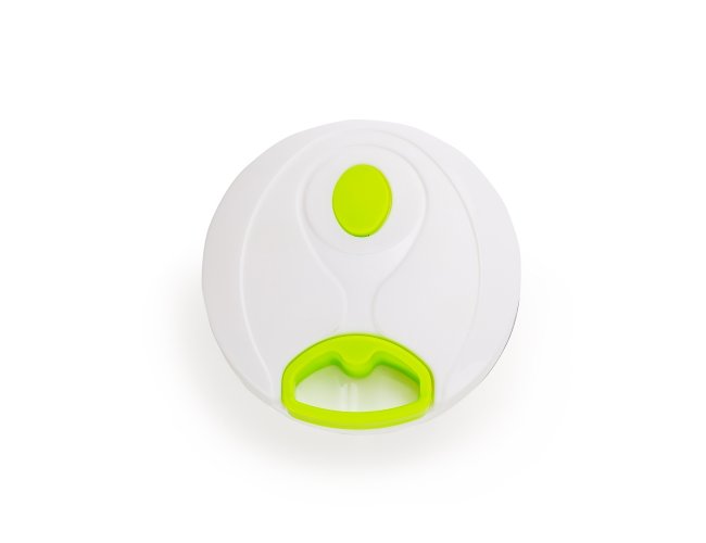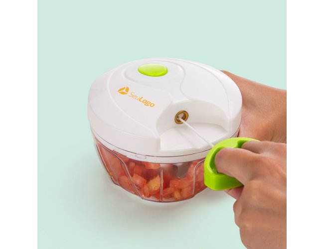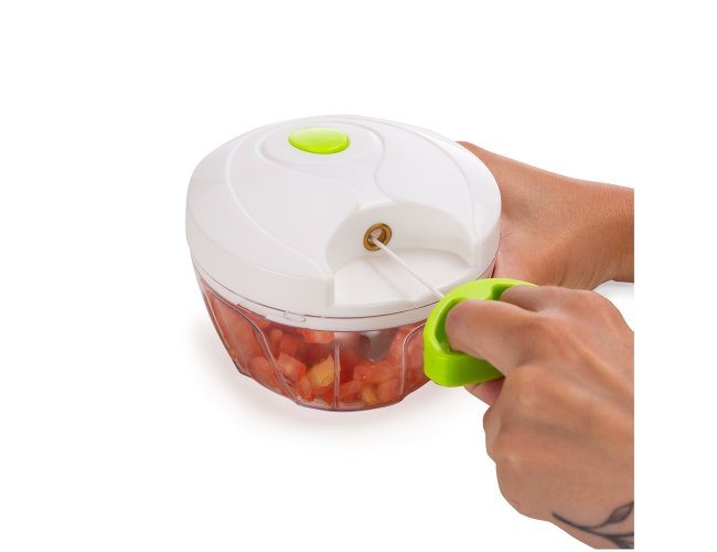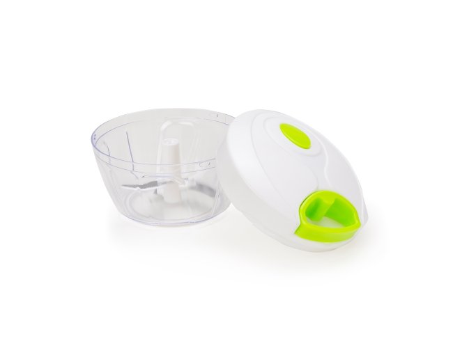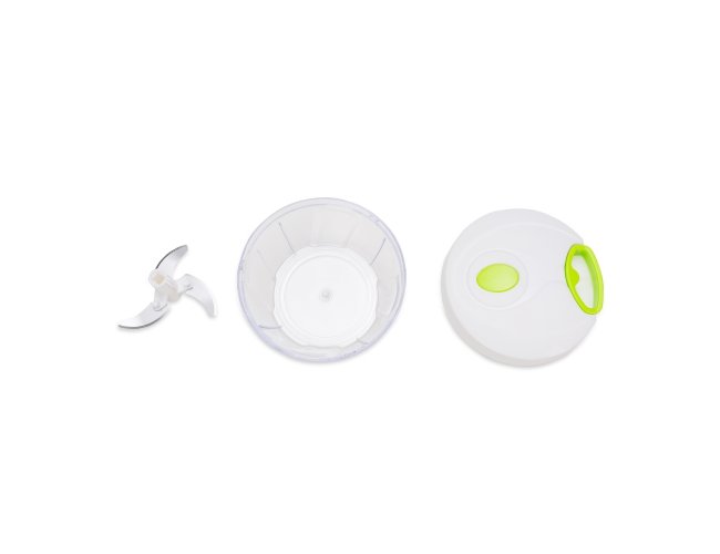 Processador de alimentos manual, tampa plástica de polipropileno com puxador verde, pote transparente em poliestireno com relevo e lâminas em aço inox.