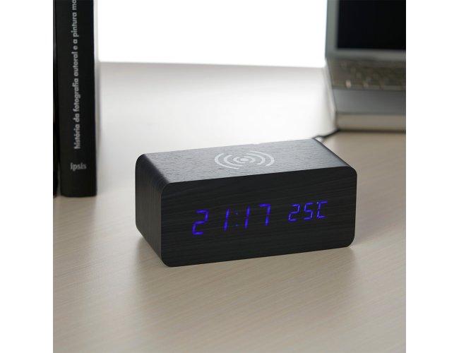 Estilo e praticidade na hora certa! O nosso Relógio digital LED possui alarme, medidor de temperatura e carregamento por indução, carregando smartphones e outros dispositivos compatíveis de forma rápida e fácil, sem a necessidade de fios. Totalmente produzido em MDF, com um display em LED, parte traseira com mecanismo para ajustes, entrada DC 5V e compartimento de pilhas. Podendo ser utilizado através da fonte USB (acompanha) ou 3 pilhas AAA (não acompanha).