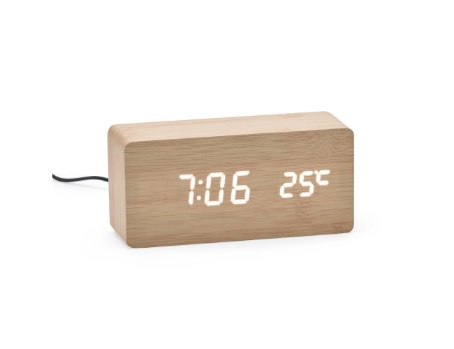 Este relógio despertador de mdf com painel de LED une, de forma harmoniosa, a tecnologia do display com o design requintado do corpo do aparelho. Com ele, é possível visualizar a hora certa, além de outras informações como data e temperatura ambiente. Apresenta, também, a opção de programar até três alarmes diferentes, definindo seus horários e frequências de ativação. Além disso, o relógio despertador pode ser ligado tanto através de 4 pilhas AAA (não acompanham o produto) quanto via cabo USB DC de 5V que acompanha o dispositivo.