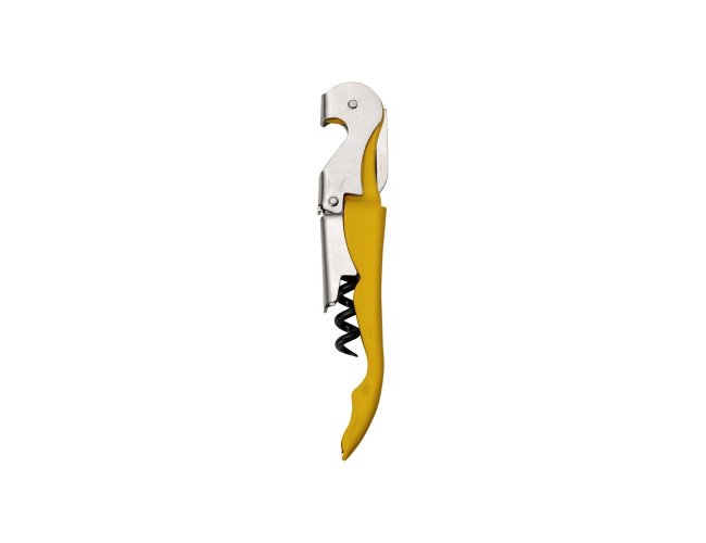Saca-rolhas metálico de 2 estágios com acabamento fosco. Contém abridor de garrafa, lâmina de corte e saca-rolhas.