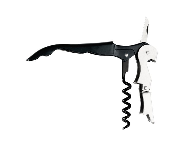 Saca-rolhas metálico de 2 estágios com acabamento brilhante. Contém abridor de garrafa, lâmina de corte e saca-rolhas.