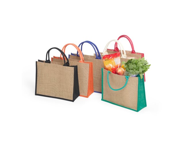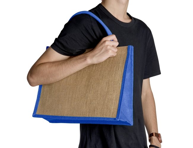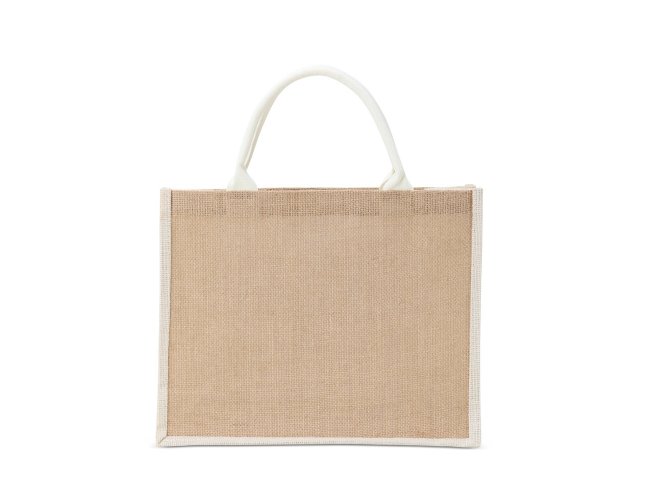 Sacola ecológica confeccionada em juta com alças costuradas na parte interna.