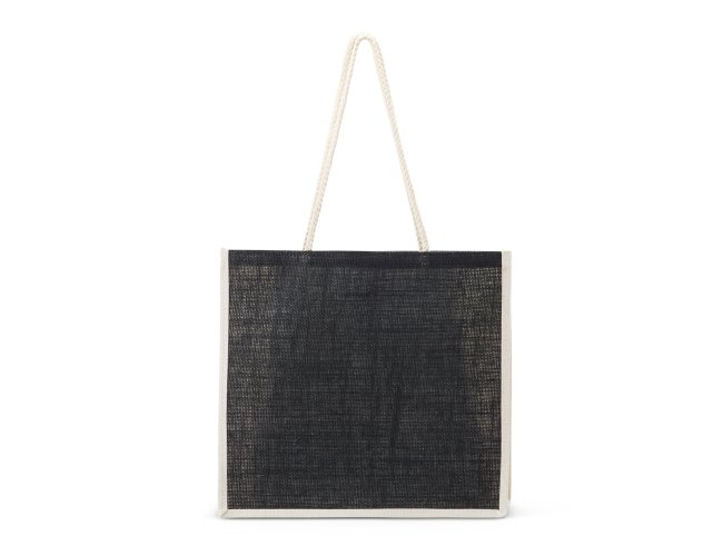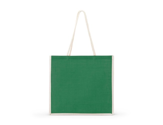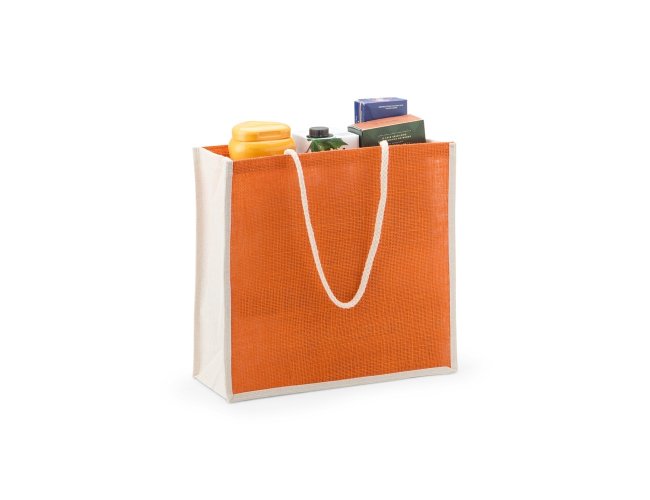 Sacola ecológica confeccionada em juta com alças costuradas na parte interna.