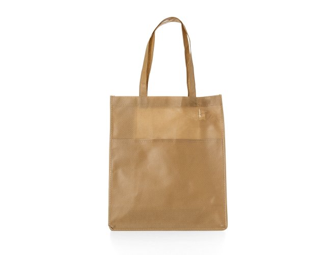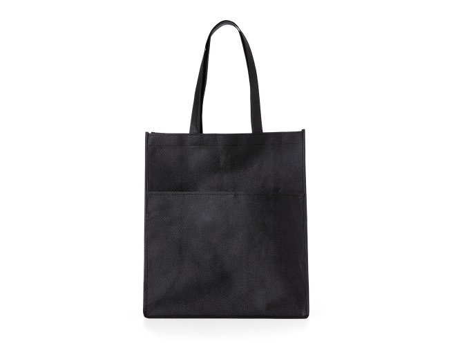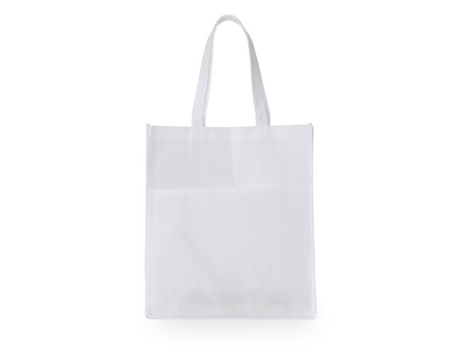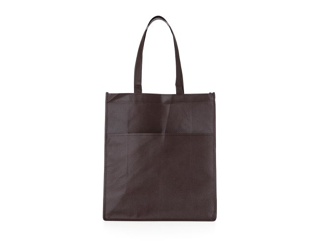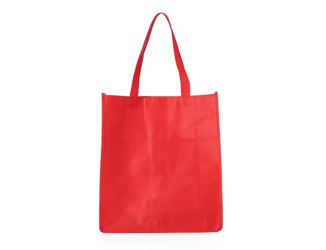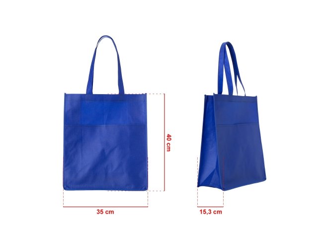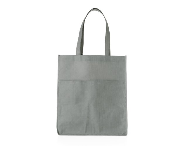 Sacola ecológica com bolso frontal externo e fundo amplo, contém alças para transporte.