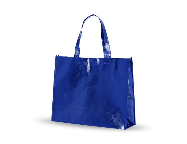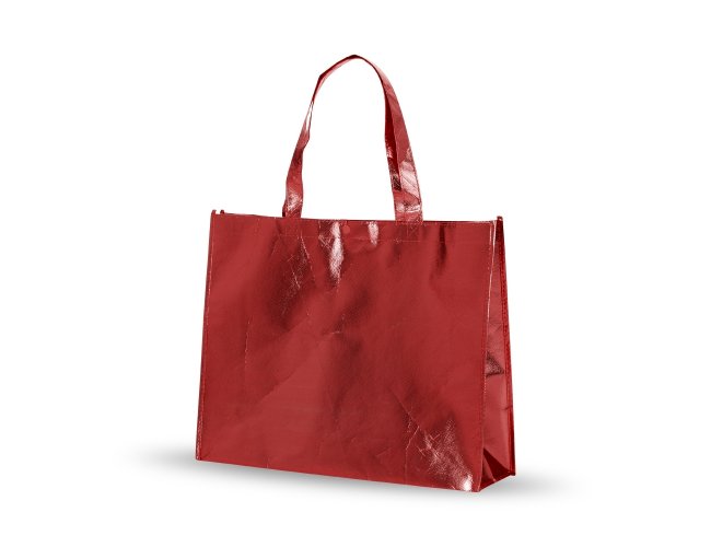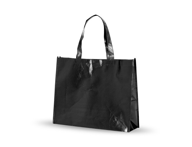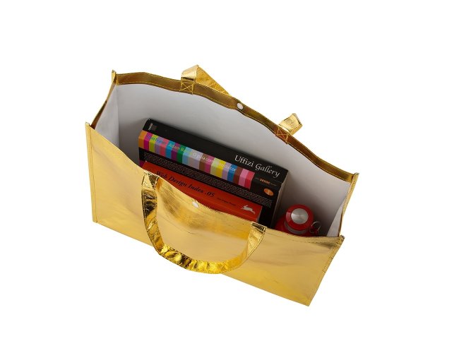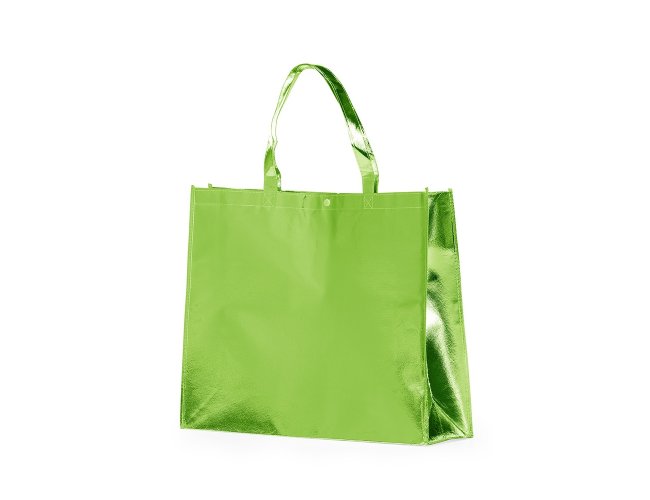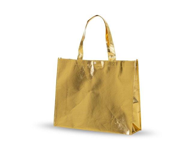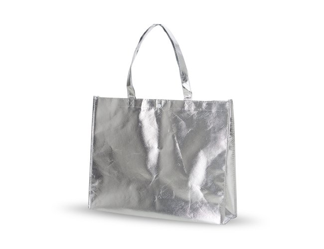 Sacola TNT metalizada 110g/m² com botão. Confeccionado em TNT com revestimento plástico laminado, parte superior possui botão plástico para fecho.
