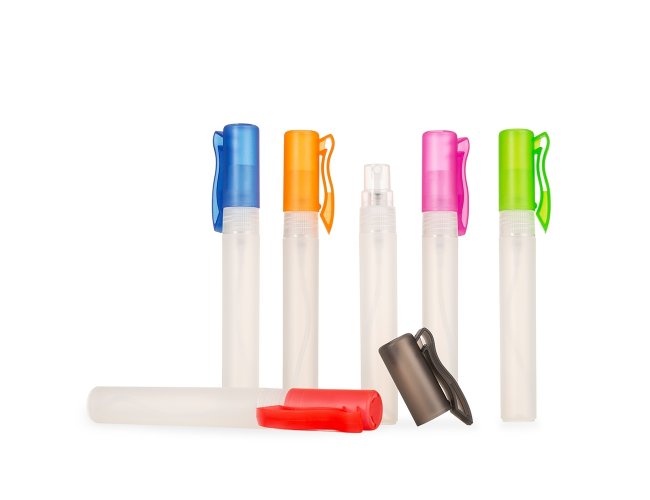 Frasco spray 9ml plástico formato bastão com acabamento fosco, contém tampa de clipe colorida e tampa transparente de spray. Para inserir essências, basta desrosquear a tampa de acionamento. Pode ser utilizado como higienizador ou porta perfume.