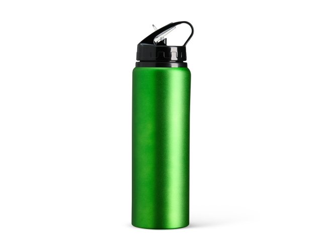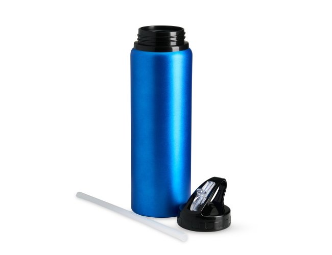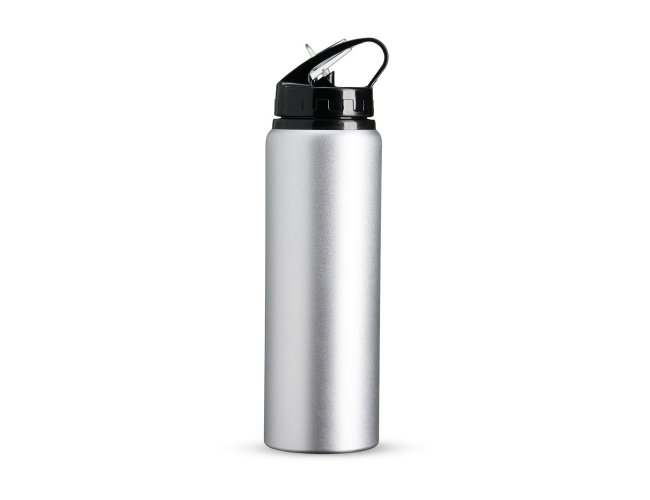 Squeeze de alumínio com capacidade de 800ml, tampa plástica com bico flip e canudo.