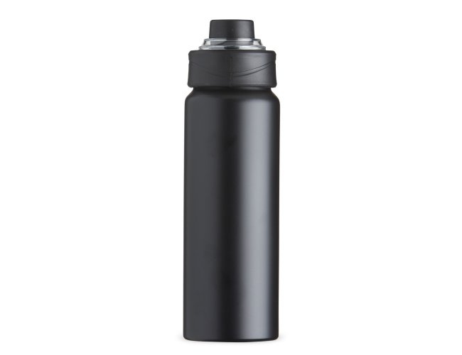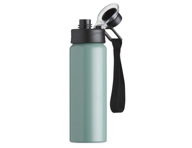 Squeeze Alumínio 800ml, possui tampa rosqueável com proteção para bocal plástica e alças de nylon e plástica.