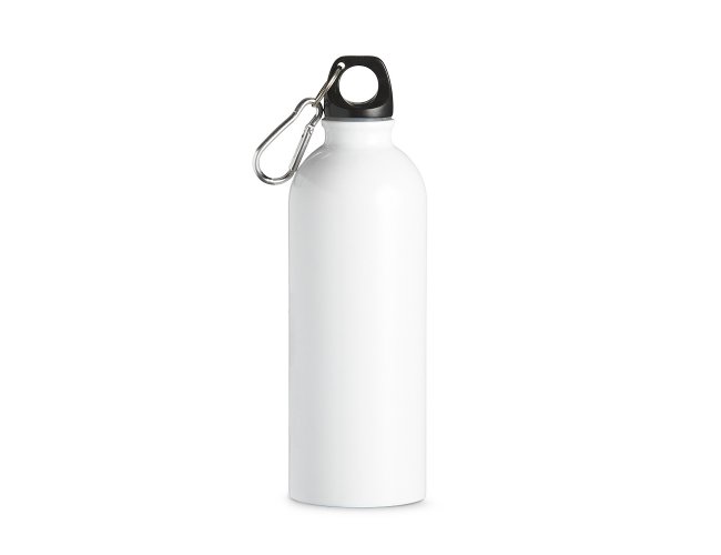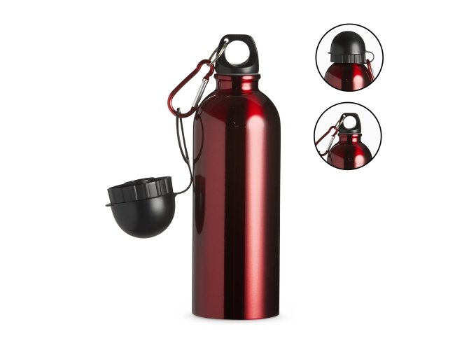 Squeeze 500ml de inox com pintura metalizada, tampa rosqueável e acompanha um segundo bico com mosquetão (não é térmico).