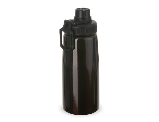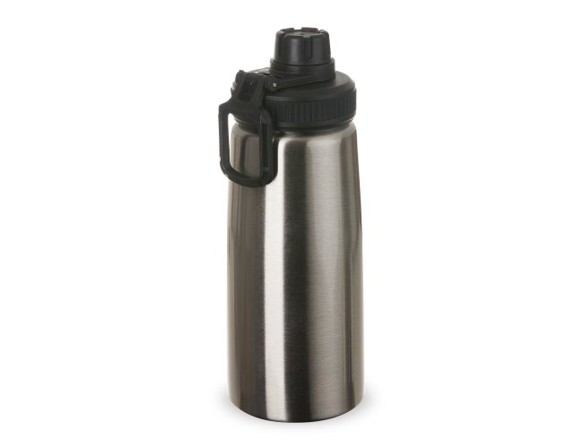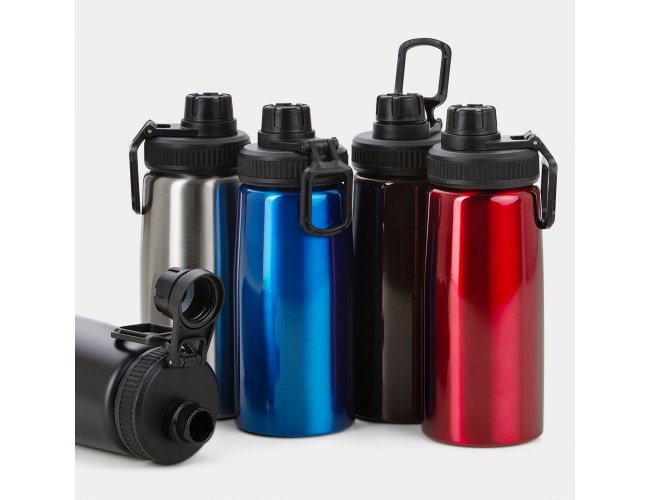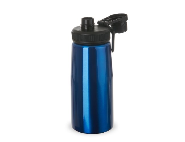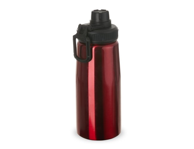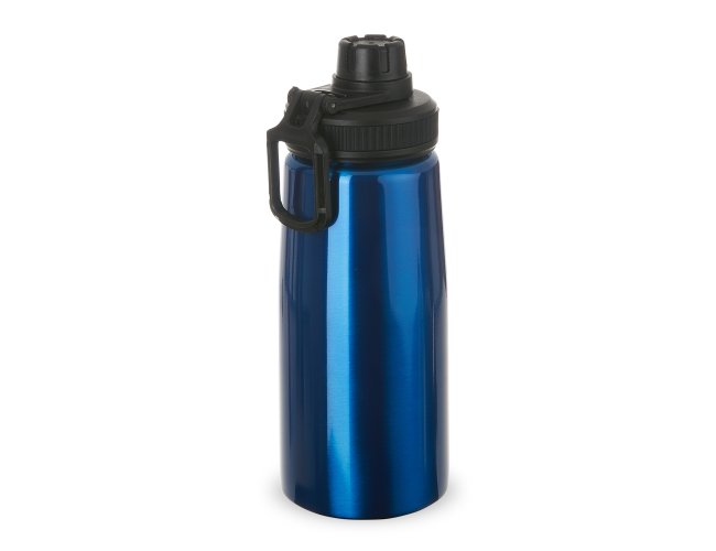 Squeeze inox 750ml com alça para transporte, possui tampa com detalhe emborrachado e tampa protetora para o bocal.