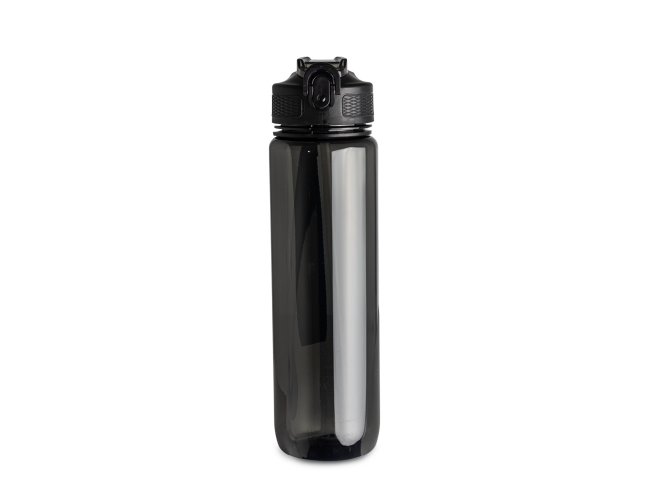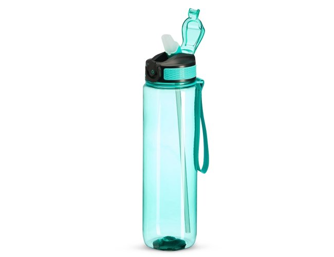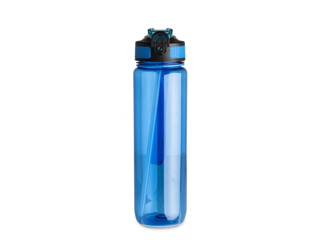 Squeeze plástico com capacidade de 1 litro, livre de BPA. Possui tampa rosqueável com bico de canudo, tampa protetora, botão de acionamento e trava de segurança. Acompanha cordão de nylon e canudo.