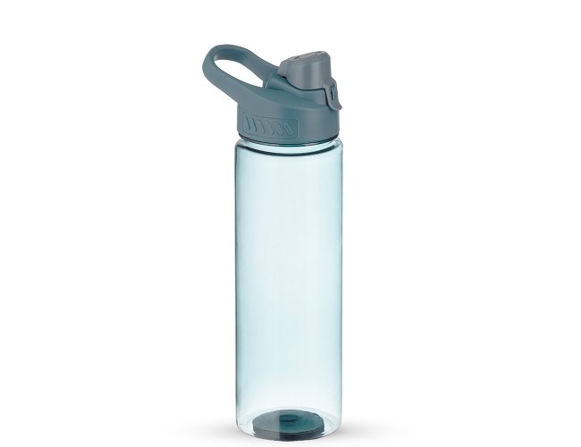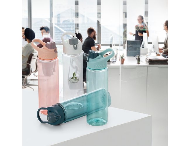 Squeeze plástico 700ml com alça para transporte, possui tampa principal rosqueável e tampa de proteção plástica com trava para o bocal.