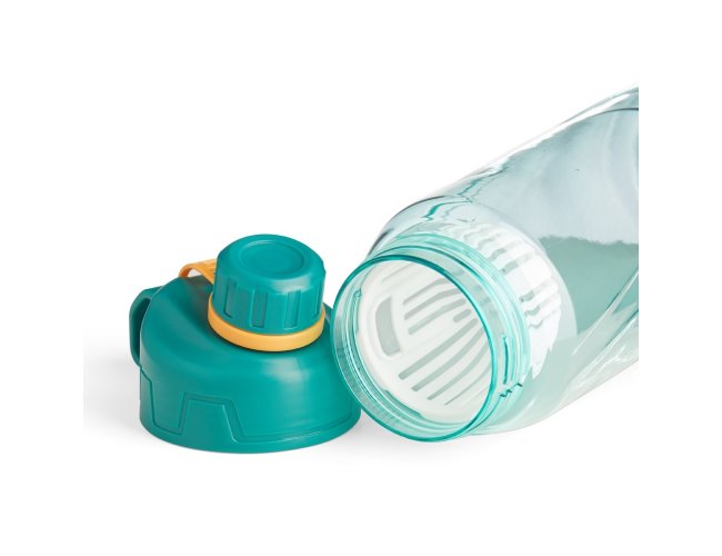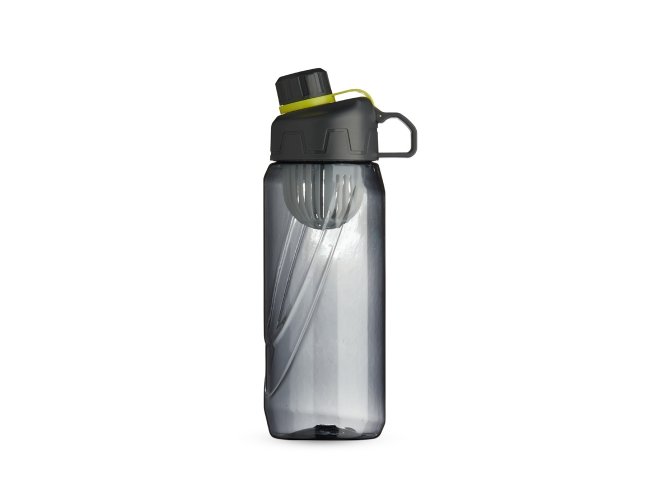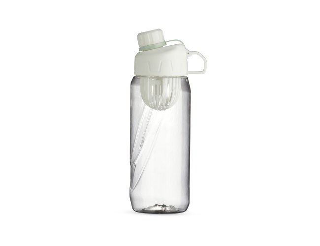 Squeeze plástico 800ml com infusor de bebidas. Com design em relevo, a squeeze possui tampa rosqueável com alça para transporte e tampa de proteção para o bocal.