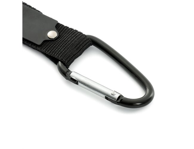 Este suporte é formado por uma alça de nylon ligada a um anel maleável, próprio para o encaixe em bocais de garrafas PET, em uma das pontas enquanto a outra apresenta um mosquetão e uma argola para chaveiro.
