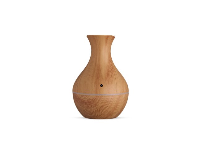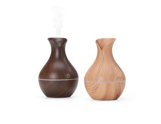 Umidificador com led de 7 cores com exibição alternada. Produzido em plástico estilizado em madeira com acabamento brilhante. Umidificador possui capacidade de até 150ml e funciona apenas a base de água. Acompanha filtro de algodão e um cabo USB. Obs.: A limpeza externa deve ser feita apenas com pano umedecido, caso submergir o produto o equipamento pode ser danificado.