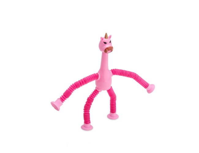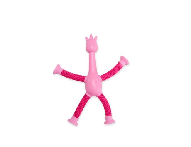 Unicórnio em plástico com braços e pernas de articulação sanfonada que esticam livremente e fixam-se em superfícies lisas por meio de quatro ventosas. Possui ainda luz interna que acende ao ser balançado.